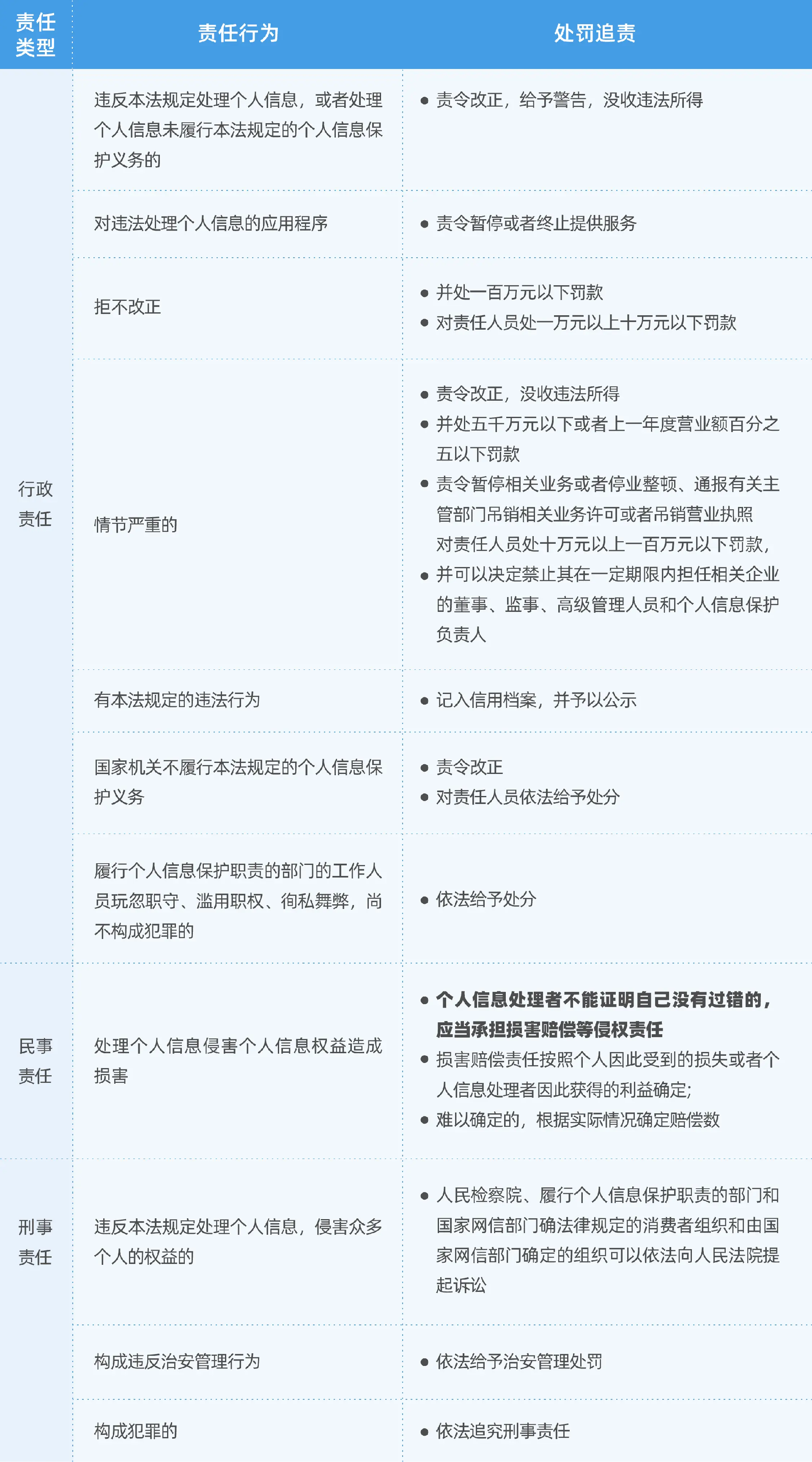 《个保法》对违法行为加大惩处力度,设置了严格的法律责任。例如,违反本法规定处理个人信息,或者处理个人信息未履行本法规定的个人信息保护义务的,情节严重的,由省级以上履行个人信息保护职责的部门责令改正,没收违法所得,并处五千万元以下或者上一年度营业额百分之五以下罚款,并可以责令暂停相关业务或者停业整顿、吊销相关业务许可或者营业执照(第六十六条)。《个保法》还增加了“记入信用档案”的处罚机制(第六十七条),相比于《网络安全法》、《民法典》等相关规定,《个保法》对个人信息相关的违法行为处罚力度更大。