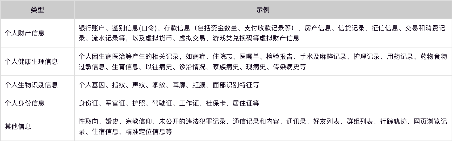 非法给予:某些个人信息仅因在个人信息主体授权同意范围外扩散,即可对个人信息主体权益带来重大风险,应判定为个人敏感信息。例如,性取向、存款信息、传染病史等。