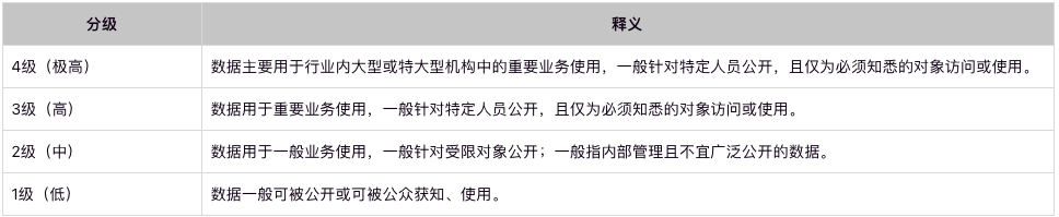 b)数据重要程度标识,与数据级别标识相对应,从⾼到低划分为:极⾼、⾼、中、低。