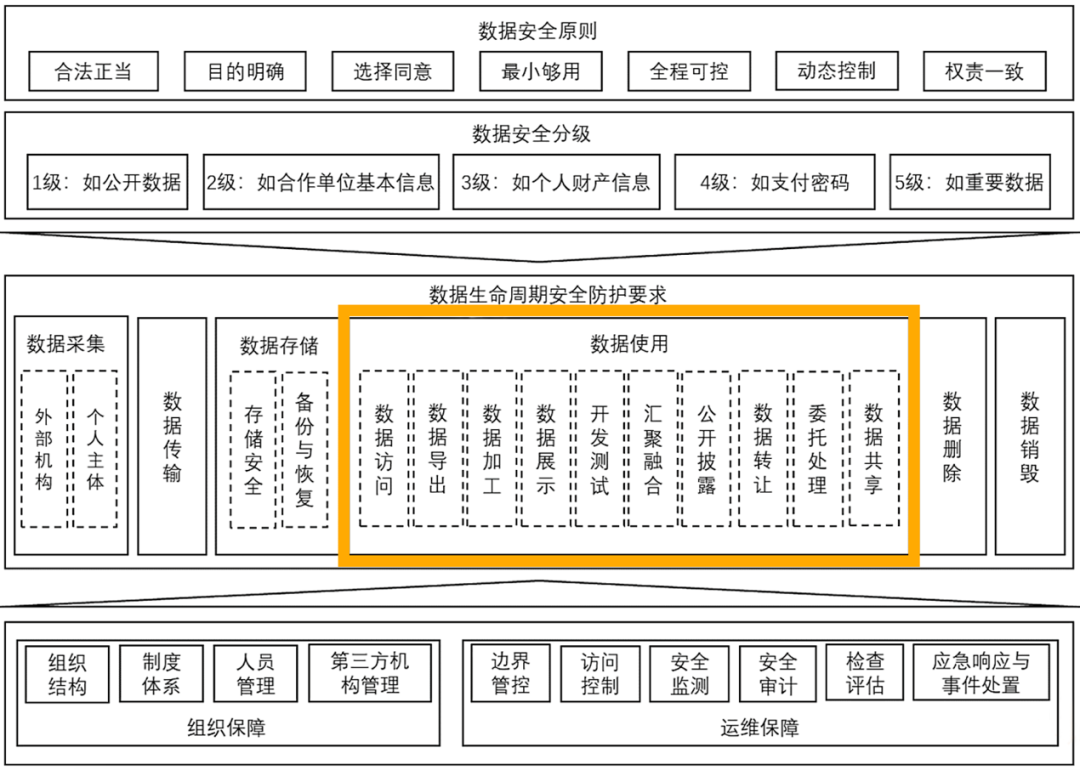 企事业单位数据安全管理针对数据生命周期中的采集、传输、存储、使用、删除、销毁等多环节召开。数据生命周期安全框架(见图1),给数据安全工作召开给予了清晰明确的整体思路。包括遵循数据安全原则,以数据安全分级为基础;建立覆盖数据生命周期全过程的安全防护体系;建立健全数据安全组织架构和明确信息系统运维环节中的数据安全需求等。